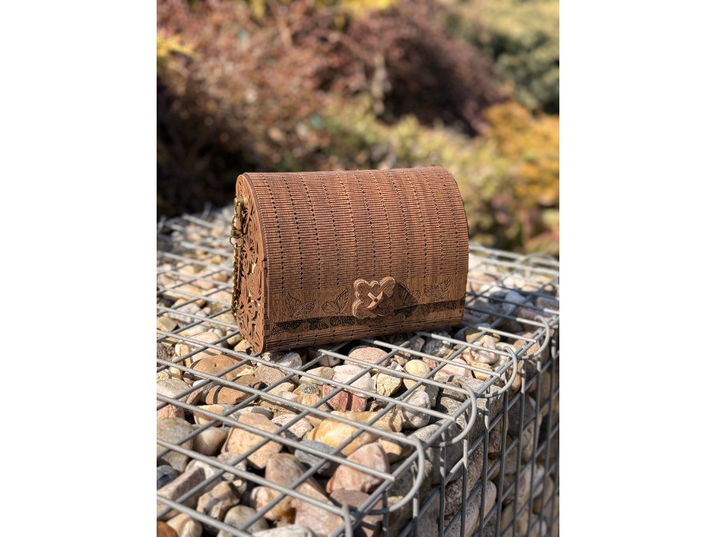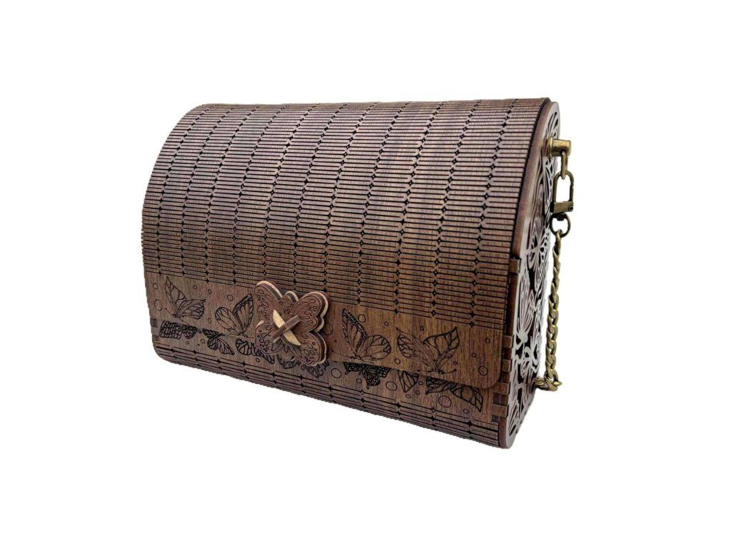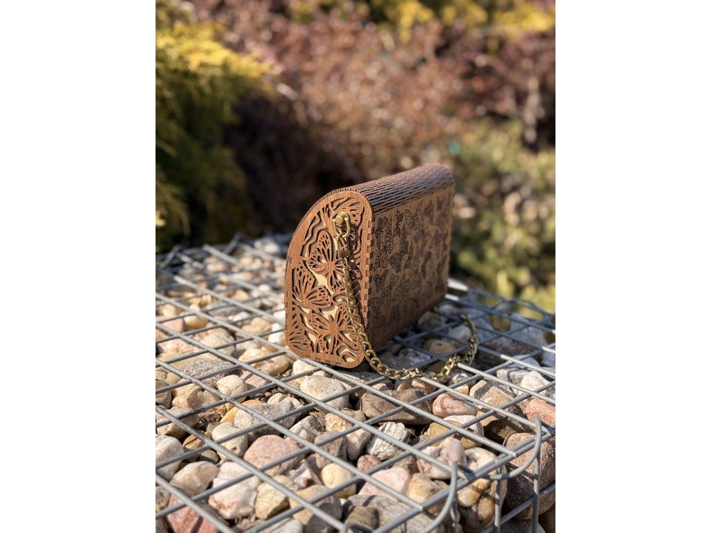 Elegantní dřevěná kabelka s precizním gravírováním motýlů zaujme na první pohled svým originálním designem. Pevná konstrukce z přírodního dřeva v kombinaci s kovovým řetízkem vytváří stylový doplněk vhodný pro společenské i volnočasové příležitosti.