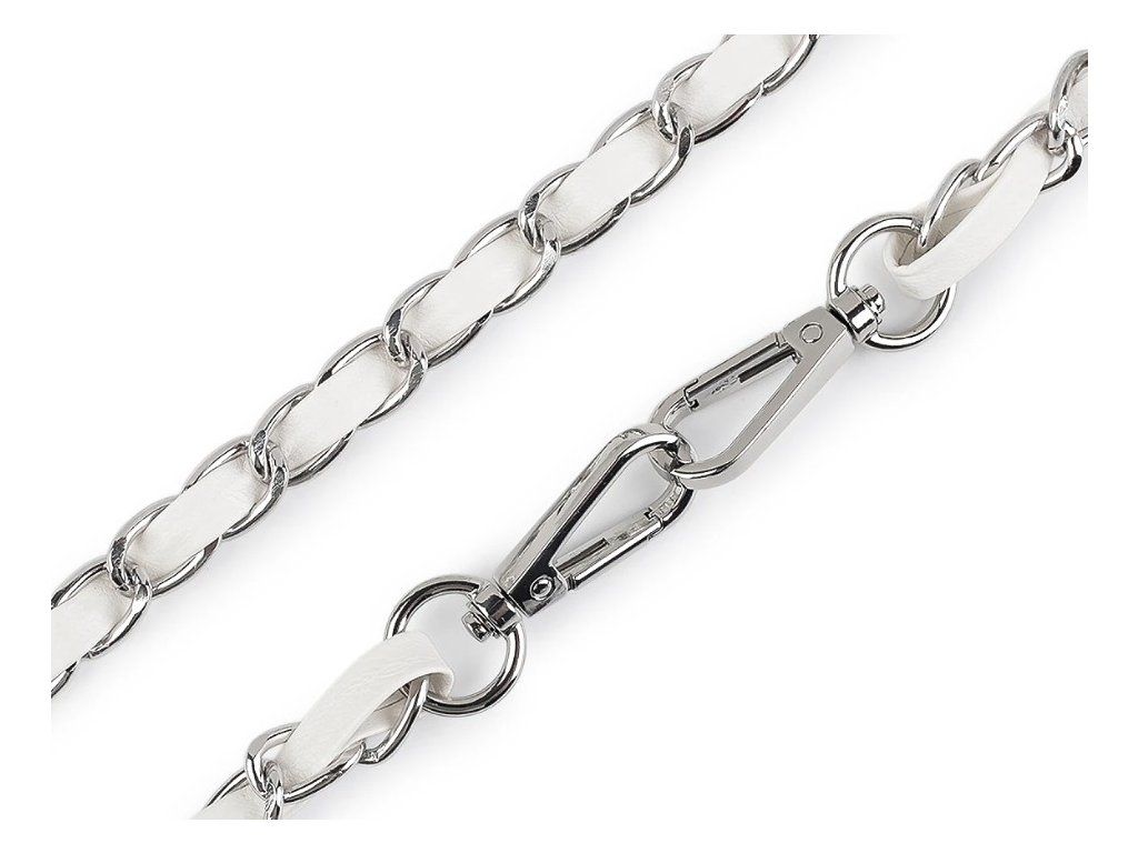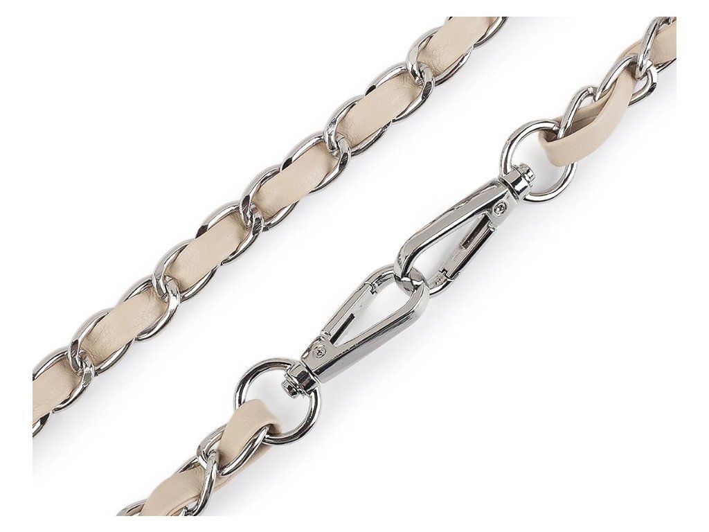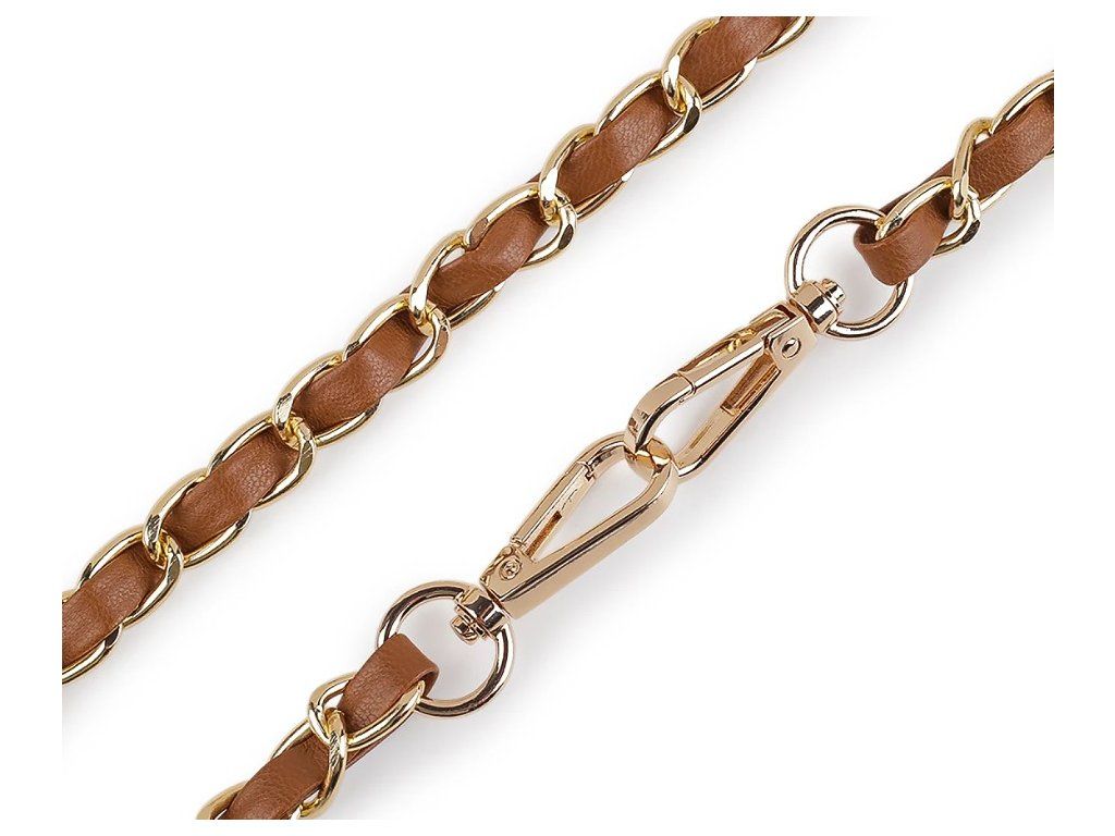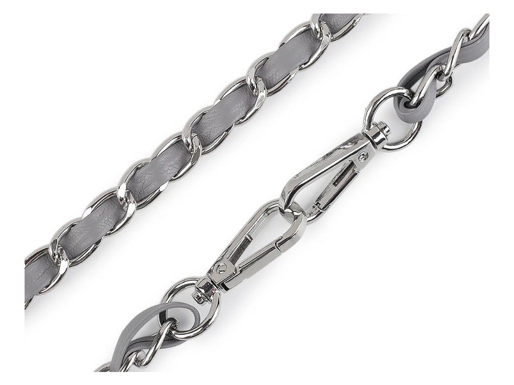 Kovový řetízek je stylově propletený páskem z eko kůže, což mu dodává atraktivní vzhled. Skvěle se hodí pro menší kabelky, psaníčka nebo pouzdra na mobil. Na obou koncích je opatřen karabinkami pro snadné připnutí.
